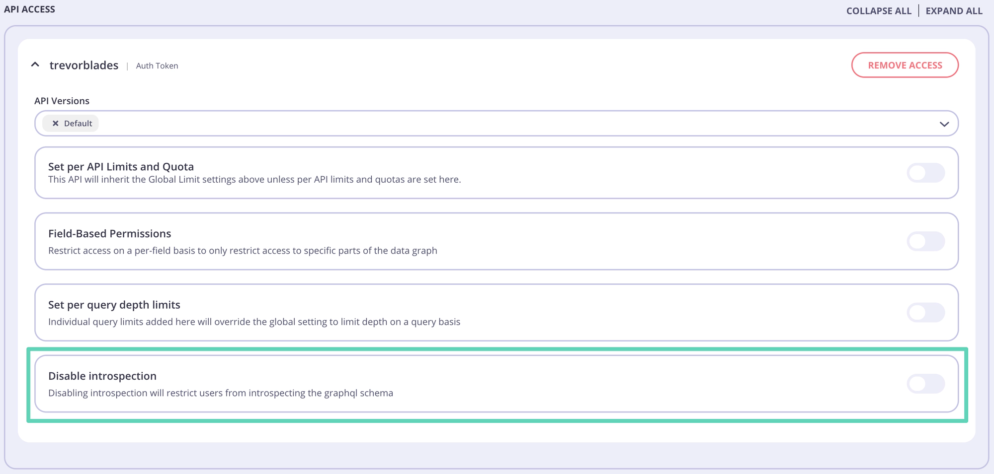 For GraphQL APIs the API ACCESS section will show additional, GQL-specific options that can be enabled.