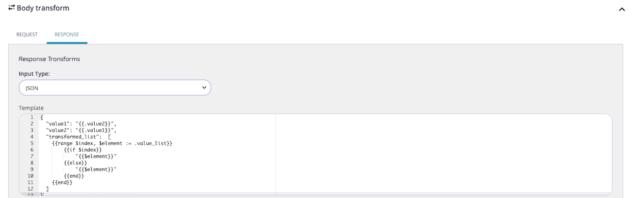 In this example, the Response Body Transform middleware is directed to use the template located in the file at location ./templates/transform_test.tmpl. The input (pre-transformation) response payload will be json format and session metadata will be available for use in the transformation.